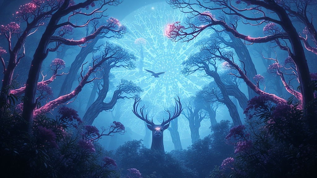 就在此时,一片巨大的、形状奇特的叶子,边缘闪烁着彩虹般的光晕,从难以企及的高空,悠悠荡荡地飘落下来。它落得极慢,轨迹优雅,仿佛被无形的手托着。青稞下意识地抬头望去,树冠层高耸入云,遮蔽了大部分天空,只有零星的、经过层层过滤的柔和光线洒下,如同神祇的恩赐。
